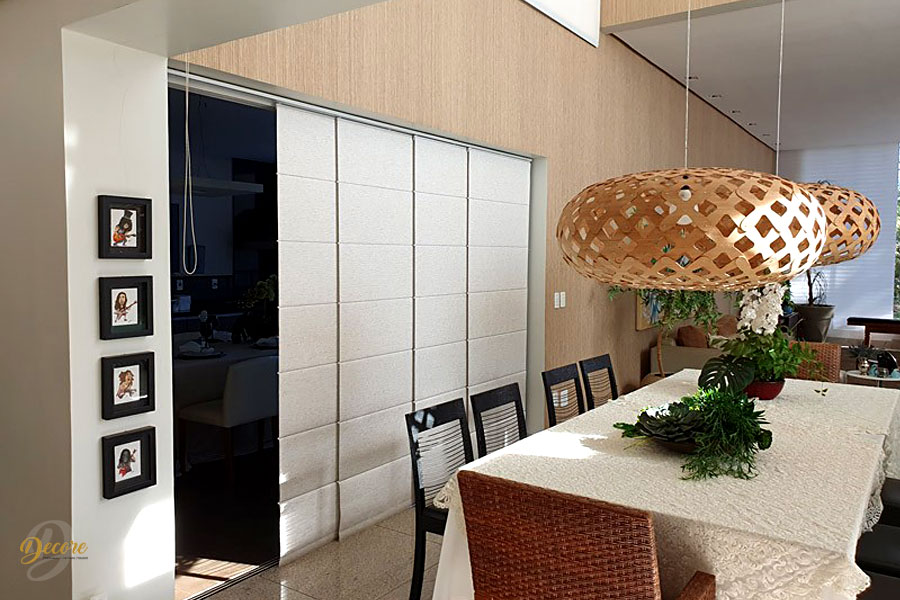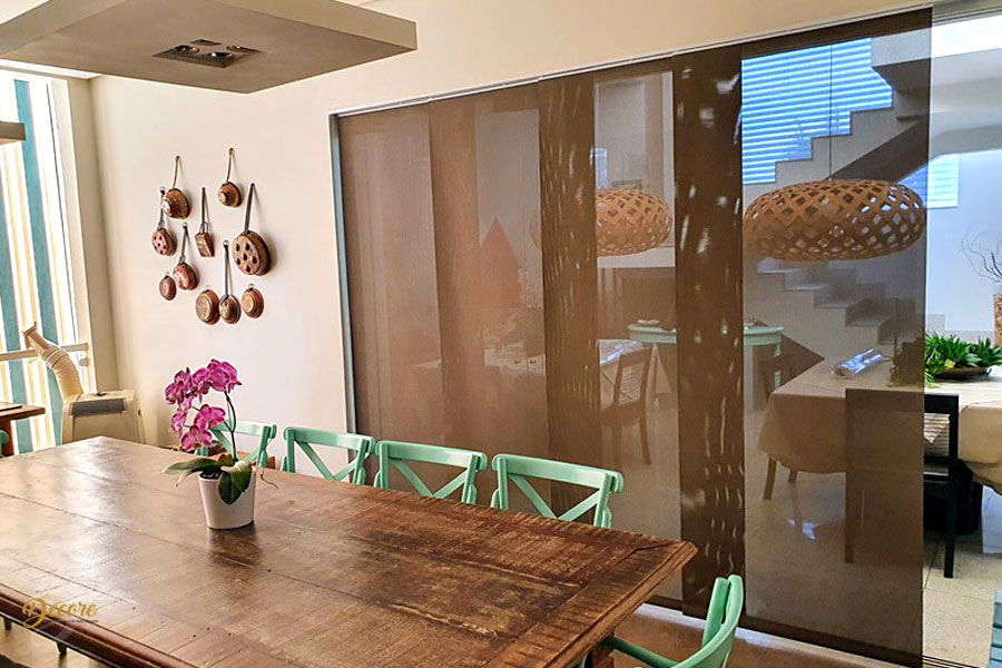 Uma característica marcante das cortinas de painel é a sua capacidade de cobrir grandes áreas de vidro, tornando-as especialmente adequadas para portas de correr ou janelas panorâmicas. Esse design proporciona um efeito visual impactante, contribuindo para a criação de um ambiente contemporâneo e bem equilibrado.